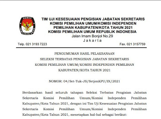 Jakarta, kpu.go.id - Pengumuman Hasil Pelaksanaan Seleksi Terbatas Pengisian Jabatan Sekretaris Komisi Pemilihan Umum/Komisi Independen Pemilihan Kabupaten/Kota Tahun 2021, Nomor: 04/Set-Tuk-JS/SetjenKPU/IX/2021. Berdasarkan hasil seluruh tahapan Seleksi Terbatas Pengisian Jabatan Sekretaris Komisi Pemilihan Umum/Komisi Independen Pemilihan Kabupaten/Kota Tahun 2021, dengan ini Tim Uji Kesesuaian Pengisian Jabatan Sekretaris Komisi Pemilihan Umum/Komisi Independen Pemilihan Kabupaten/Kota Tahun 2021, menetapkan hal-hal sebagai berikut: