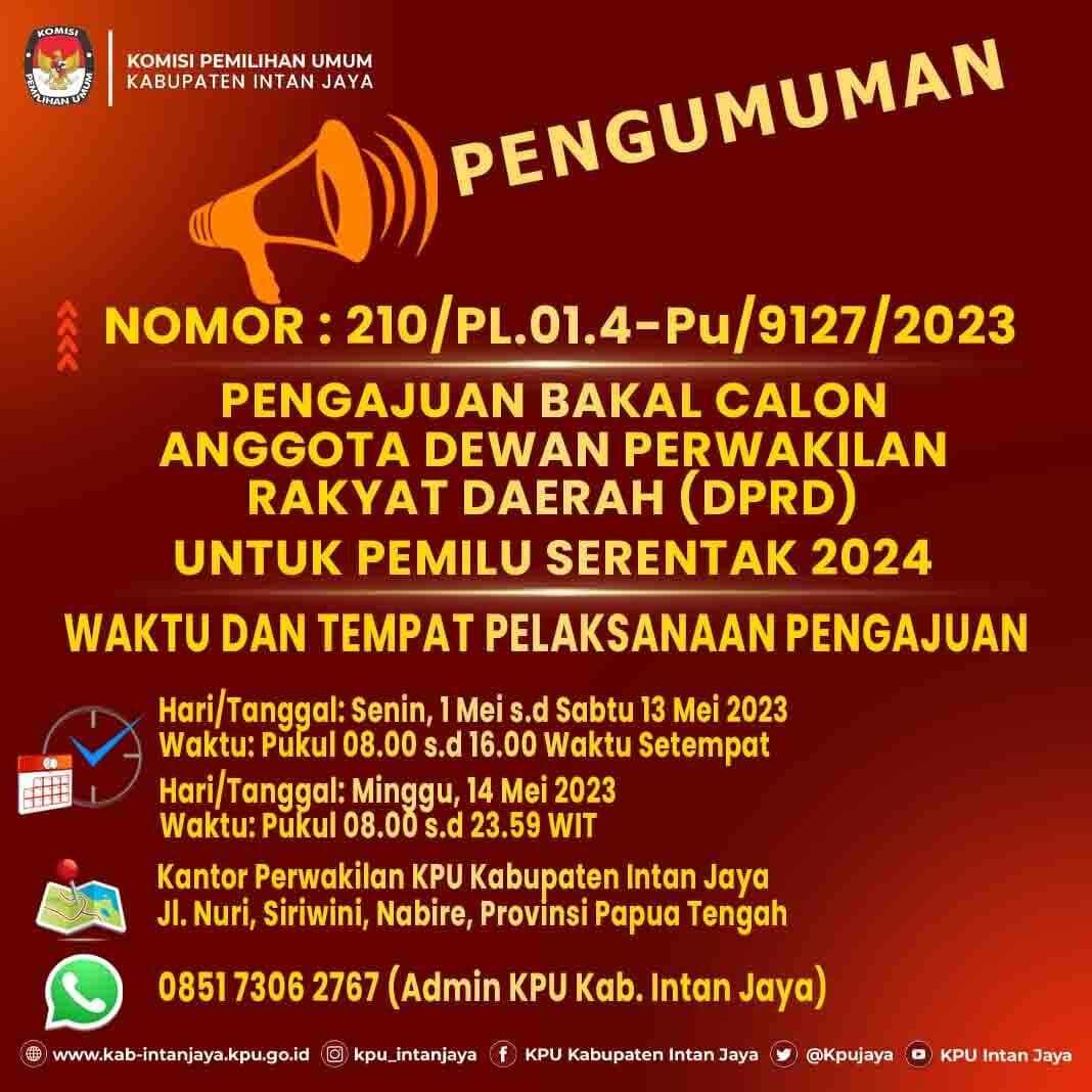 Klik Download : PENGUMUMAN PENGAJUAN BAKAL CALON ANGGOTA DEWAN PERWAKILAN RAKYAT DAERAH KABUPATEN INTAN JAYA UNTUK PEMILU SERENTAK TAHUN 2024
